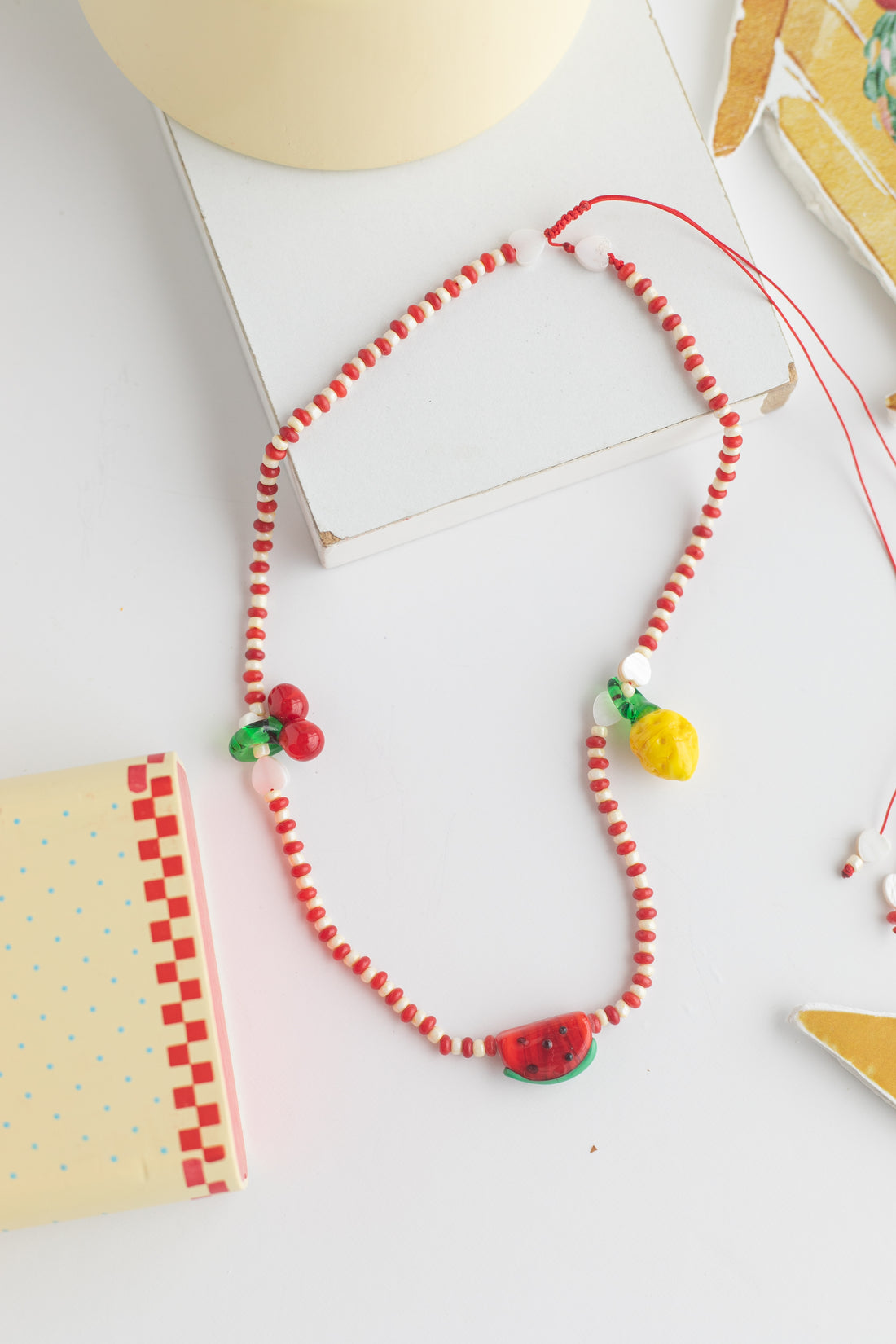 Tamamen el yapımı cam boncuklardan üretilmiş, karpuz, limon ve kiraz Murano boncuk detaylı kırmızı-beyaz dizi...