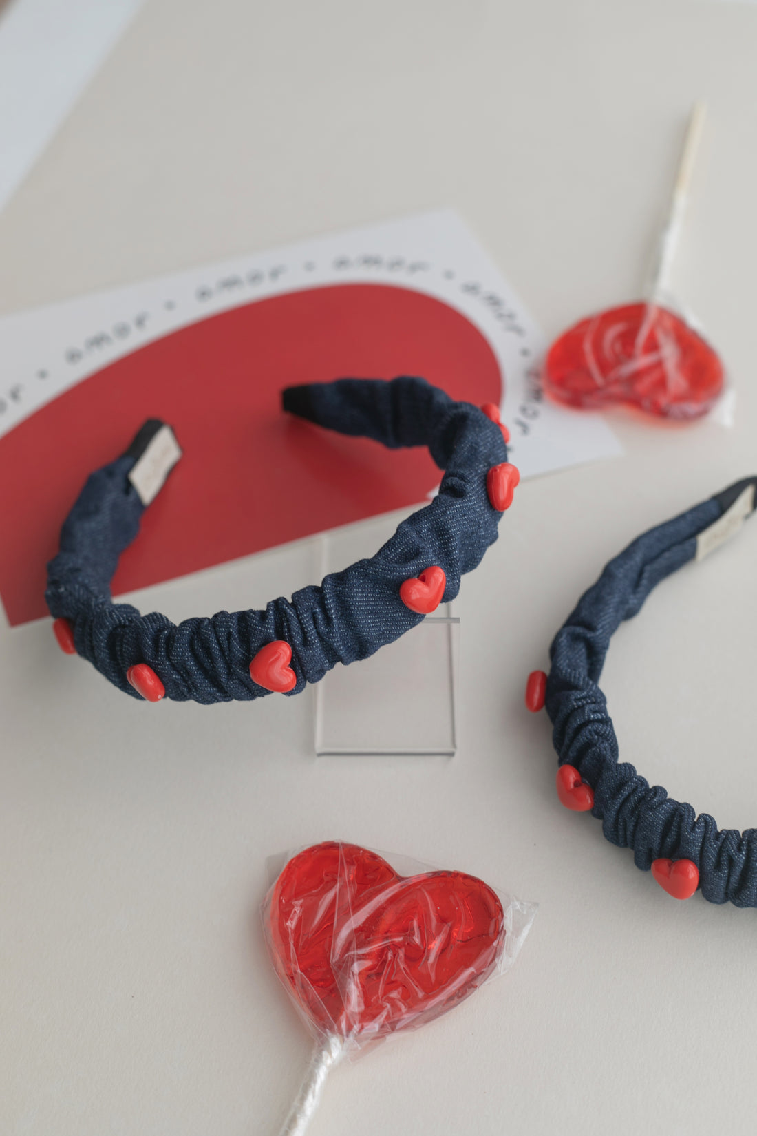 Kalp Islemeli Büzgülü Indigo Denim Taç