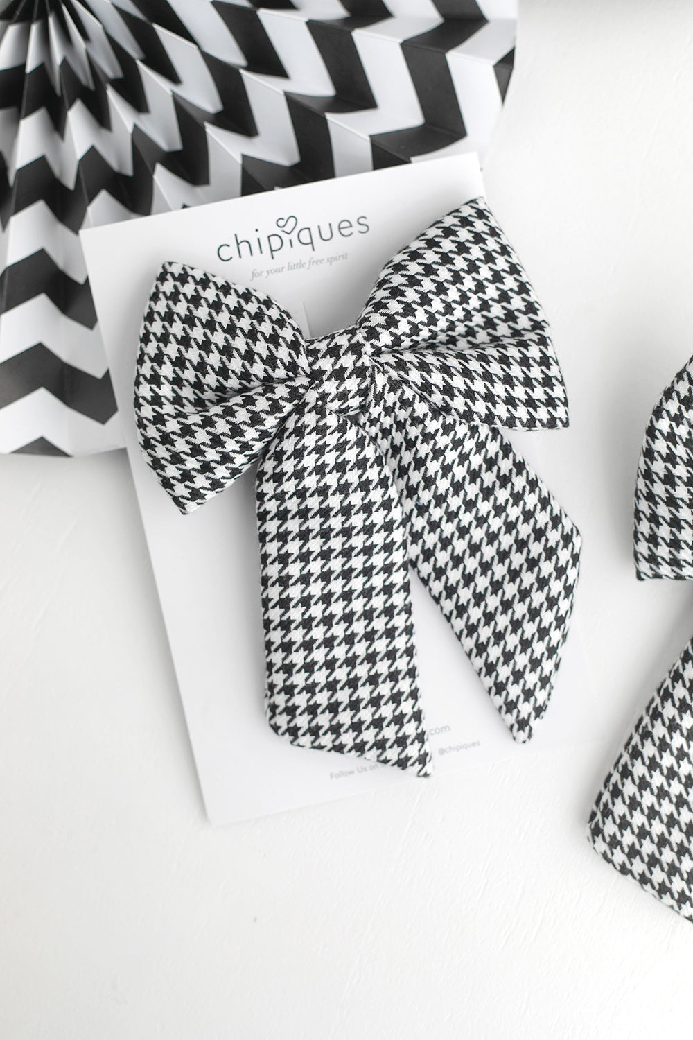 Klasik ve şık görünümüyle öne çıkan Kazayağı Desenli Siyah Beyaz Kuyruklu Balerin Fiyonk Toka, modern...