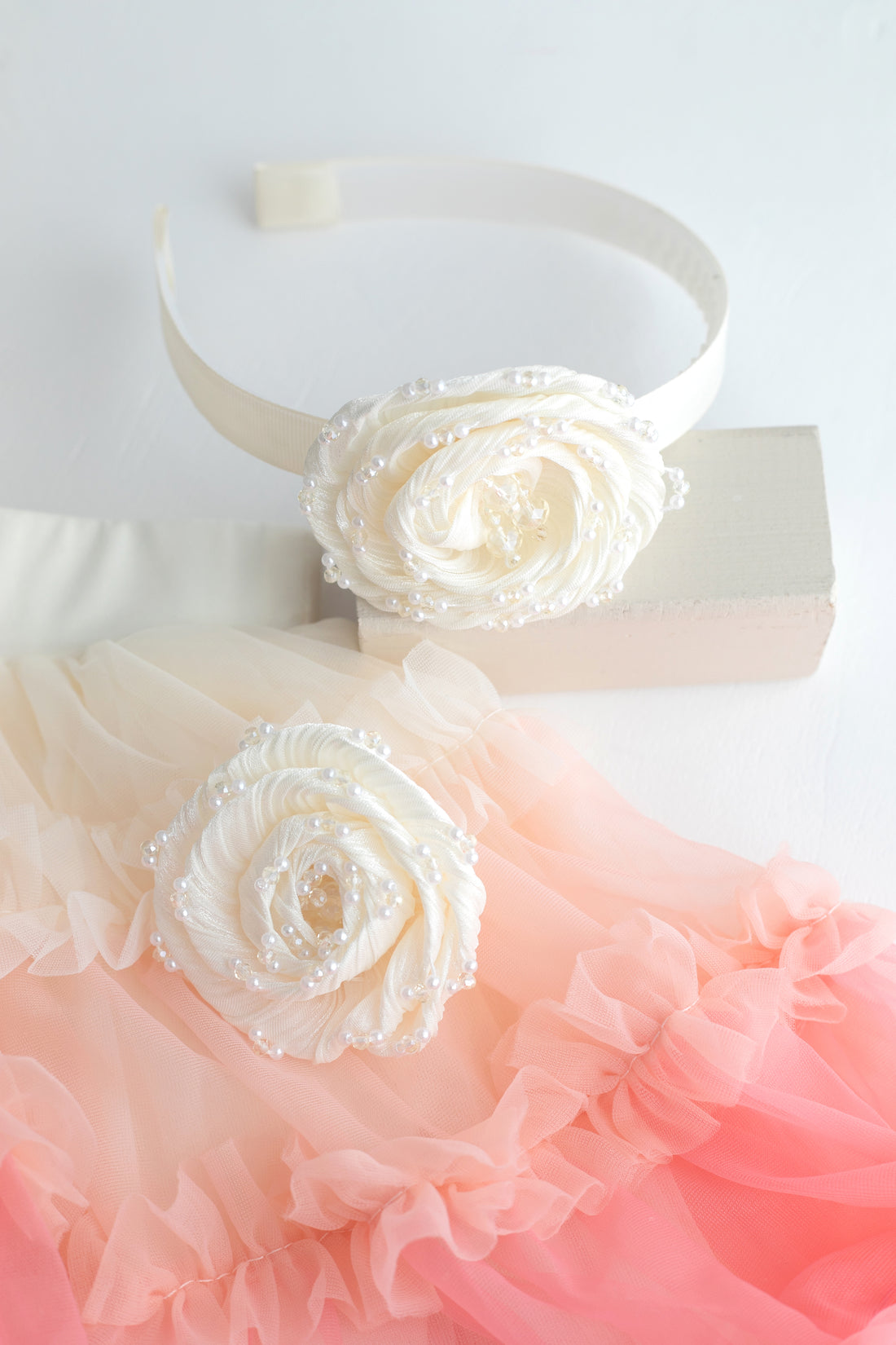 Krem Inci Islemeli Saten Gul Figurlu Cicek Tac