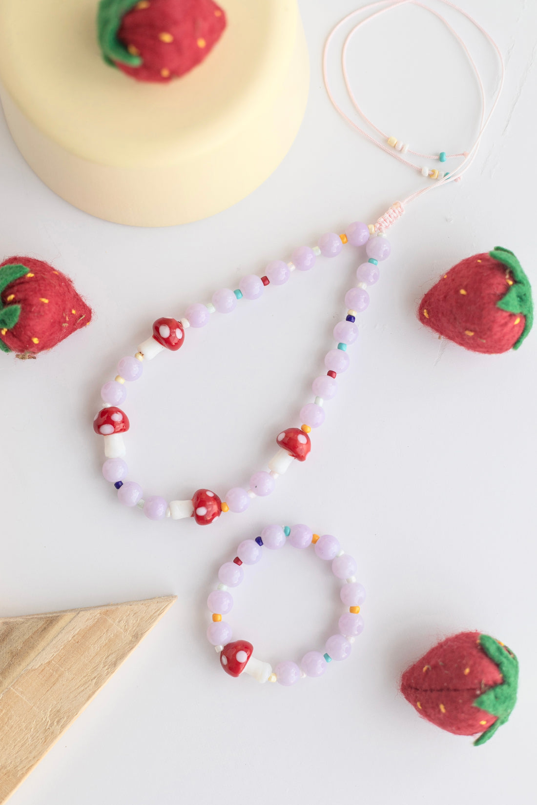 Kırmızı Murano Mantar Boncuklu Lila Kolye ve Bileklik Set - Çocuk