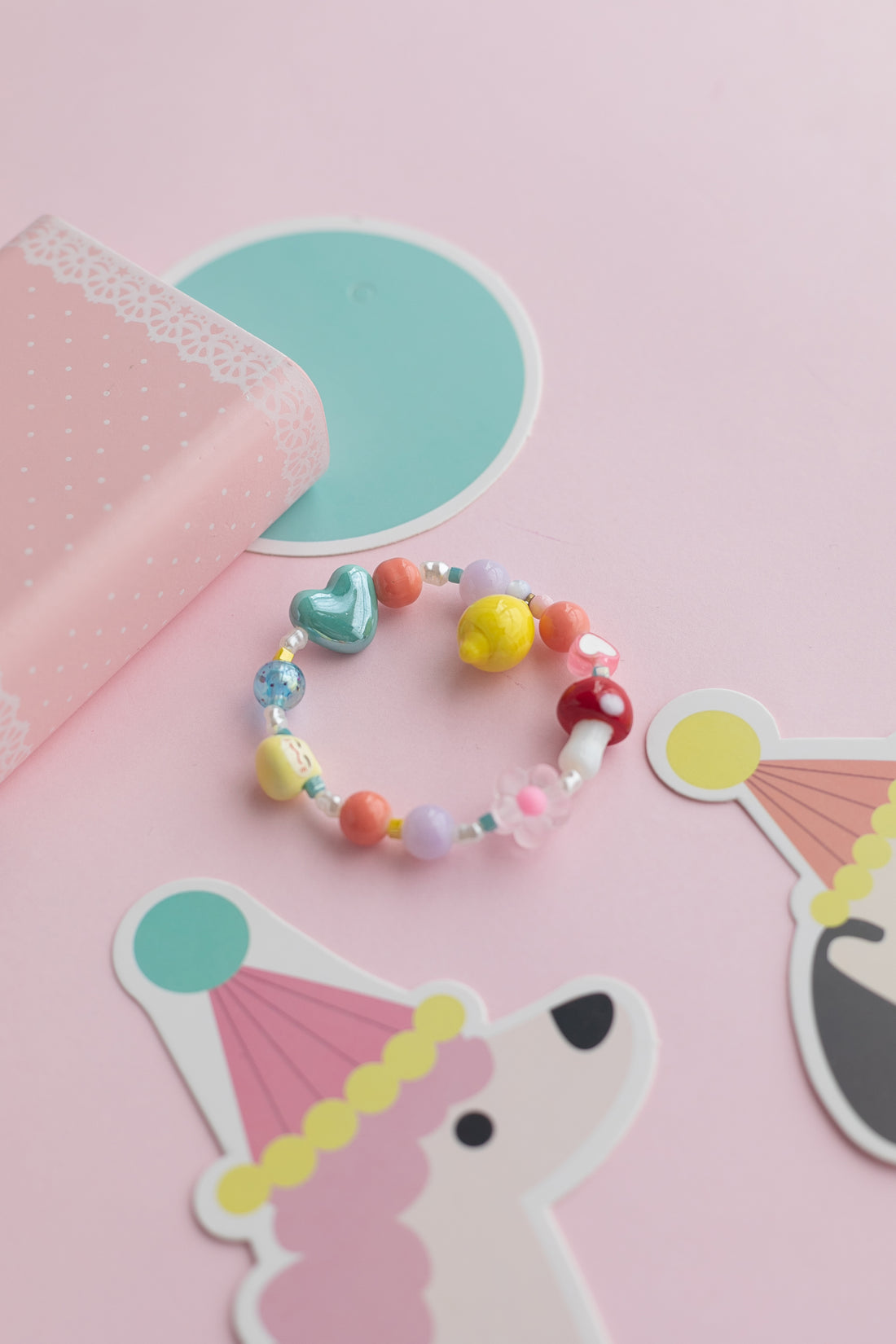 Renkli ve eğlenceli tasarımıyla öne çıkan mantar ve limon figürlü Murano cam boncuk bileklik,...