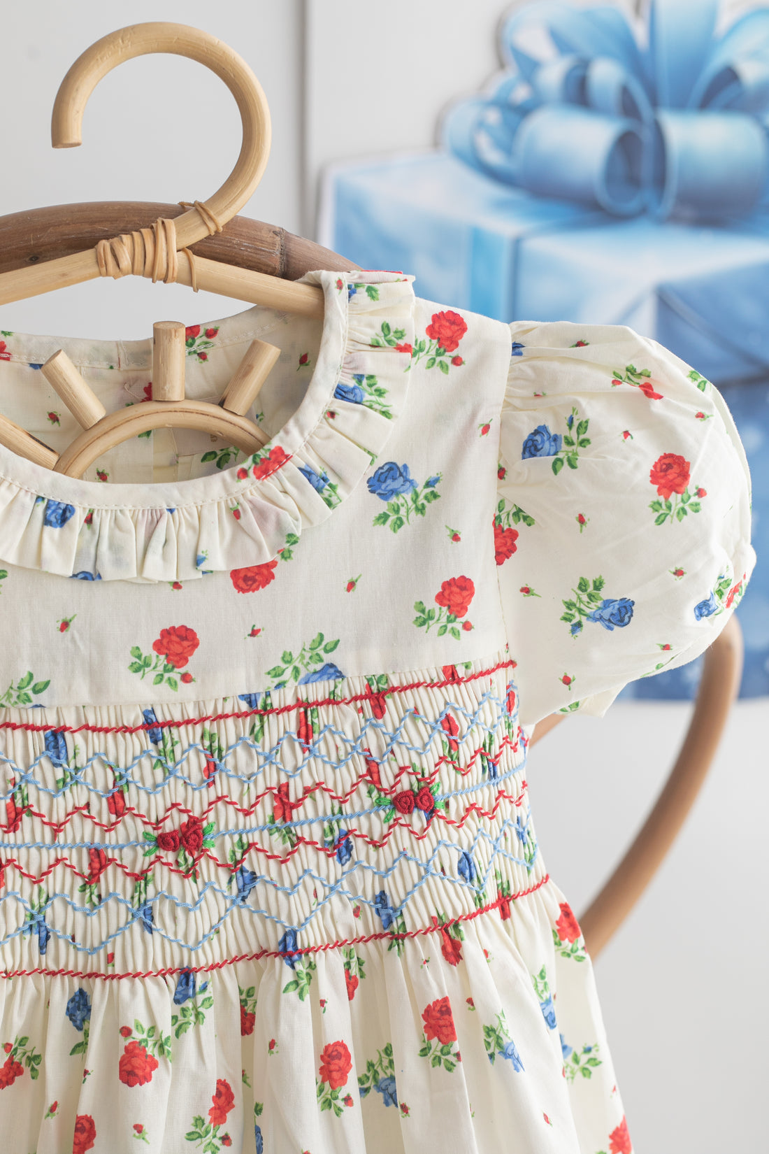 Mavi Gul Motifli Beyaz Gipeli Elbise