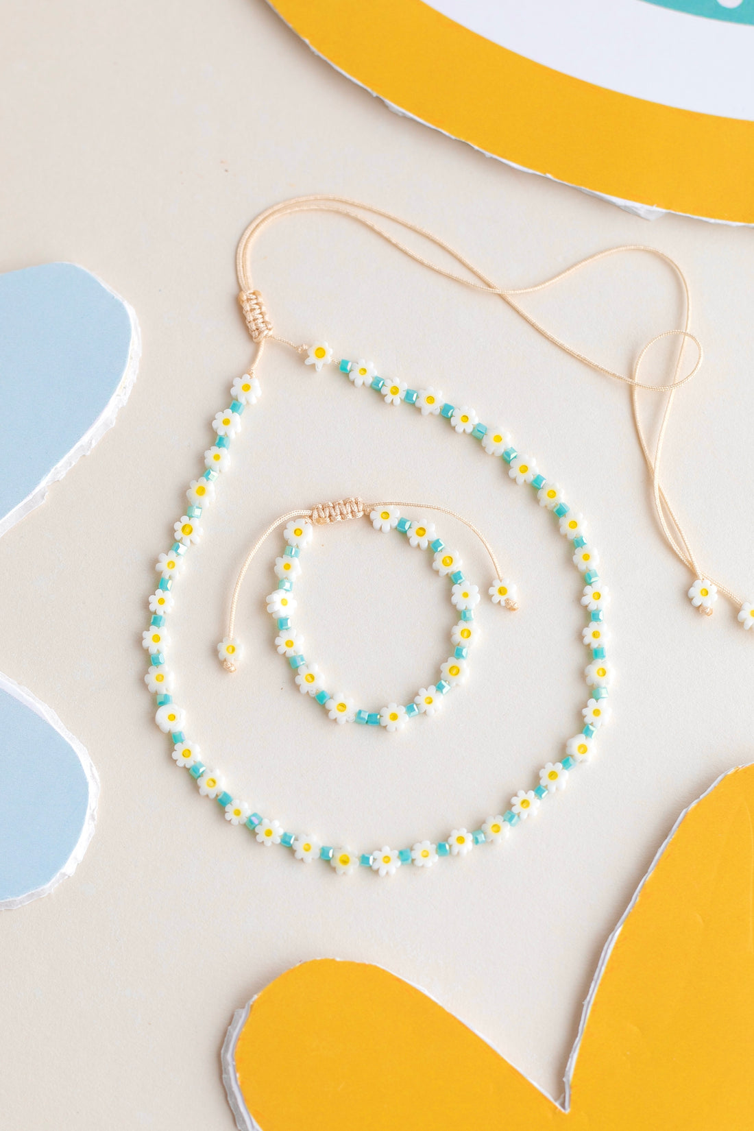 Doğal ve zarif görünümüyle öne çıkan papatyalı sedef boncuklu kolye ve bileklik set, el yapımı...