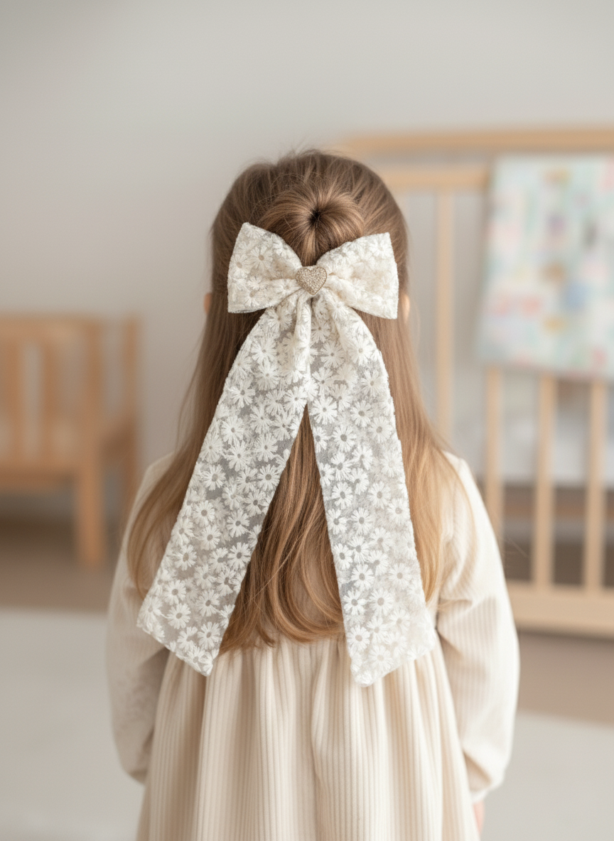 Zarif tasarımıyla dikkat çeken Mini Çiçek Nakışlı Ekru Dantel Tül Kuyruklu Balerin Klips Toka, minik...