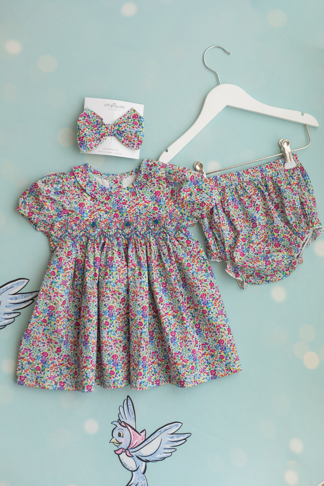 Mini Floral Sulu Boya Desenli Gipeli Nakışlı Bandanalı Külotlu Dokuma Bebek Takımı