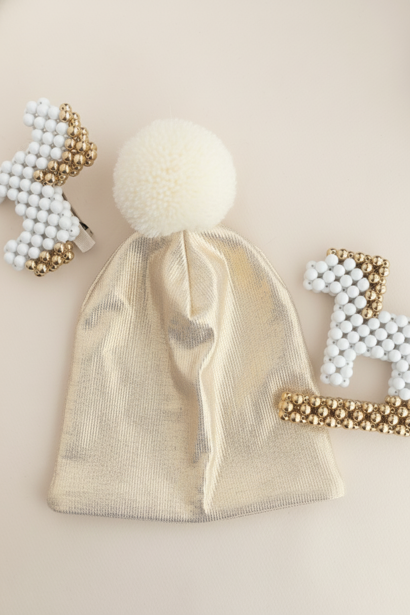 Gold Varak Baskili Krem Ponpon Cift Katli LikrlI Penye Bere