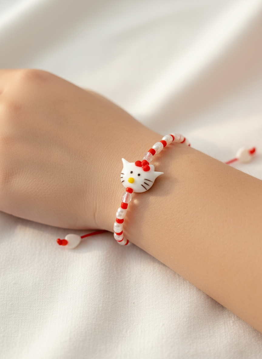 Kedi Figürlü Murano Cam Boncuk Sargılı Dizi Boncuklu Çocuk Bileklik