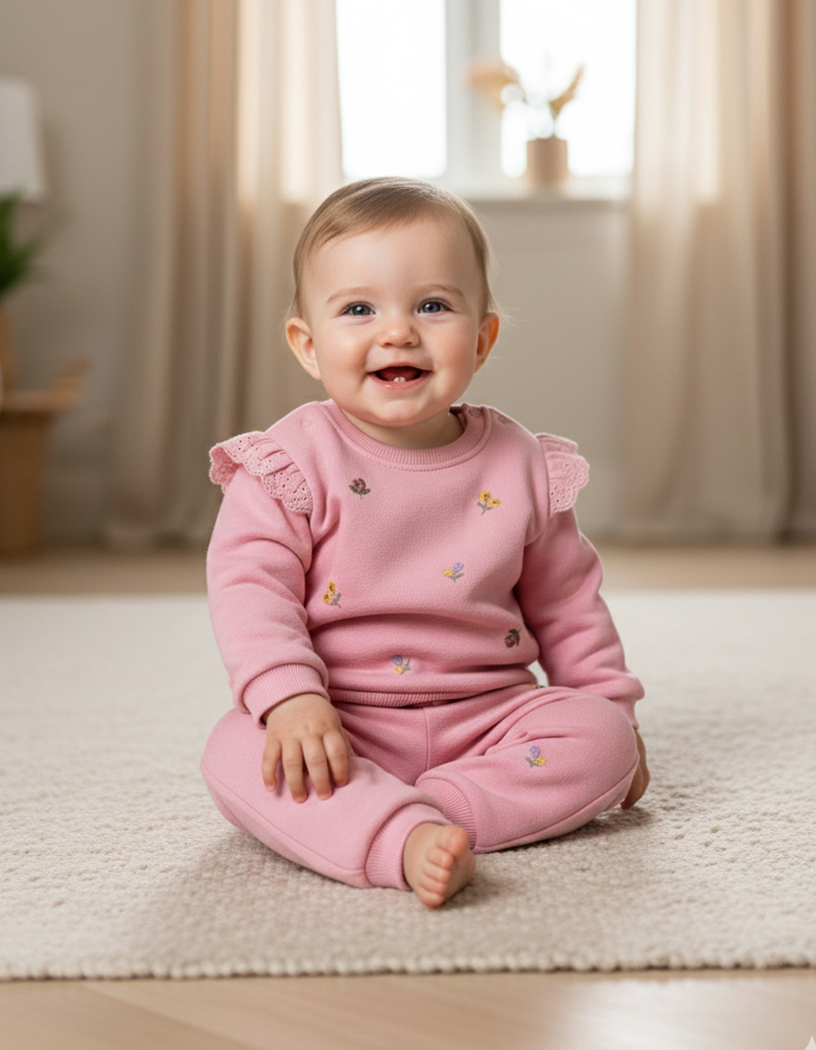 Çiçek Nakışlı Pembe Şardonlu Kalın Sweatshirt Takım
