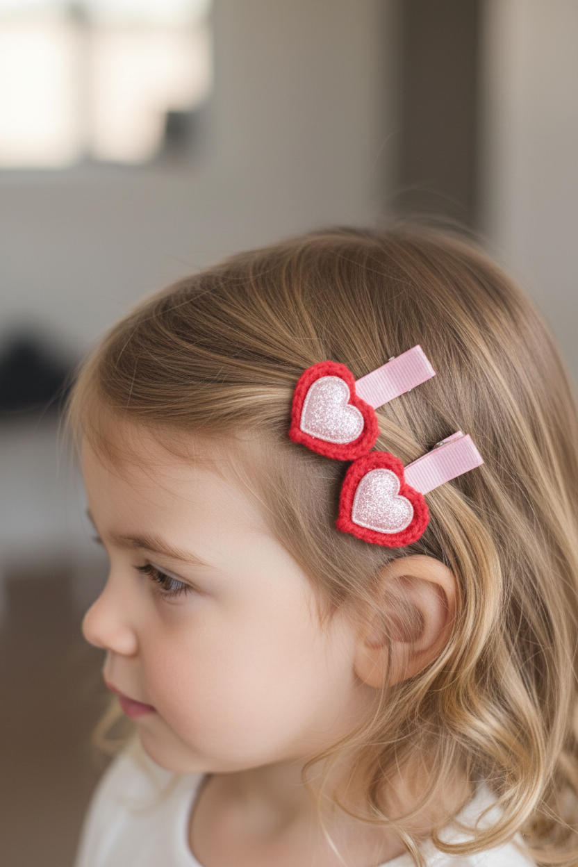 El yapımı crochet (örgü) kalp formu üzerine yerleştirilen ışıltılı pembe glitter aplikeler, bu tokalara hem romantik...