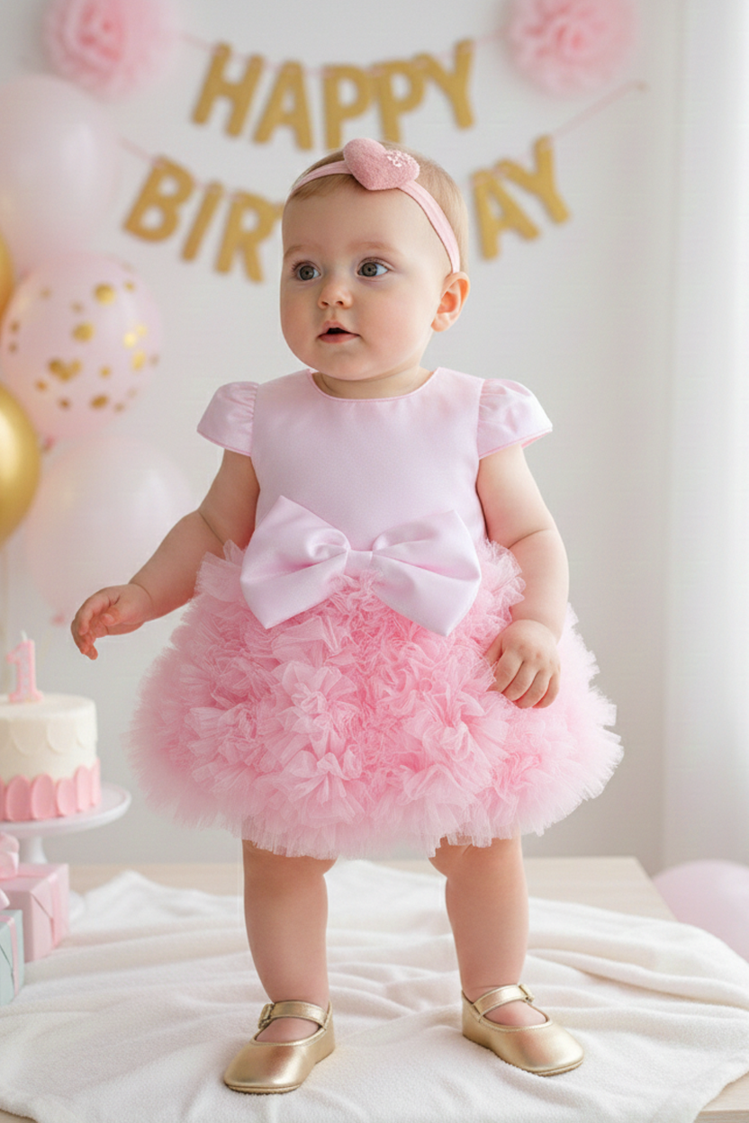 Pembe Işıltılı Tütü Bebek Elbise – Büyük Fiyonk Detaylı Özel Gün Elbisesi