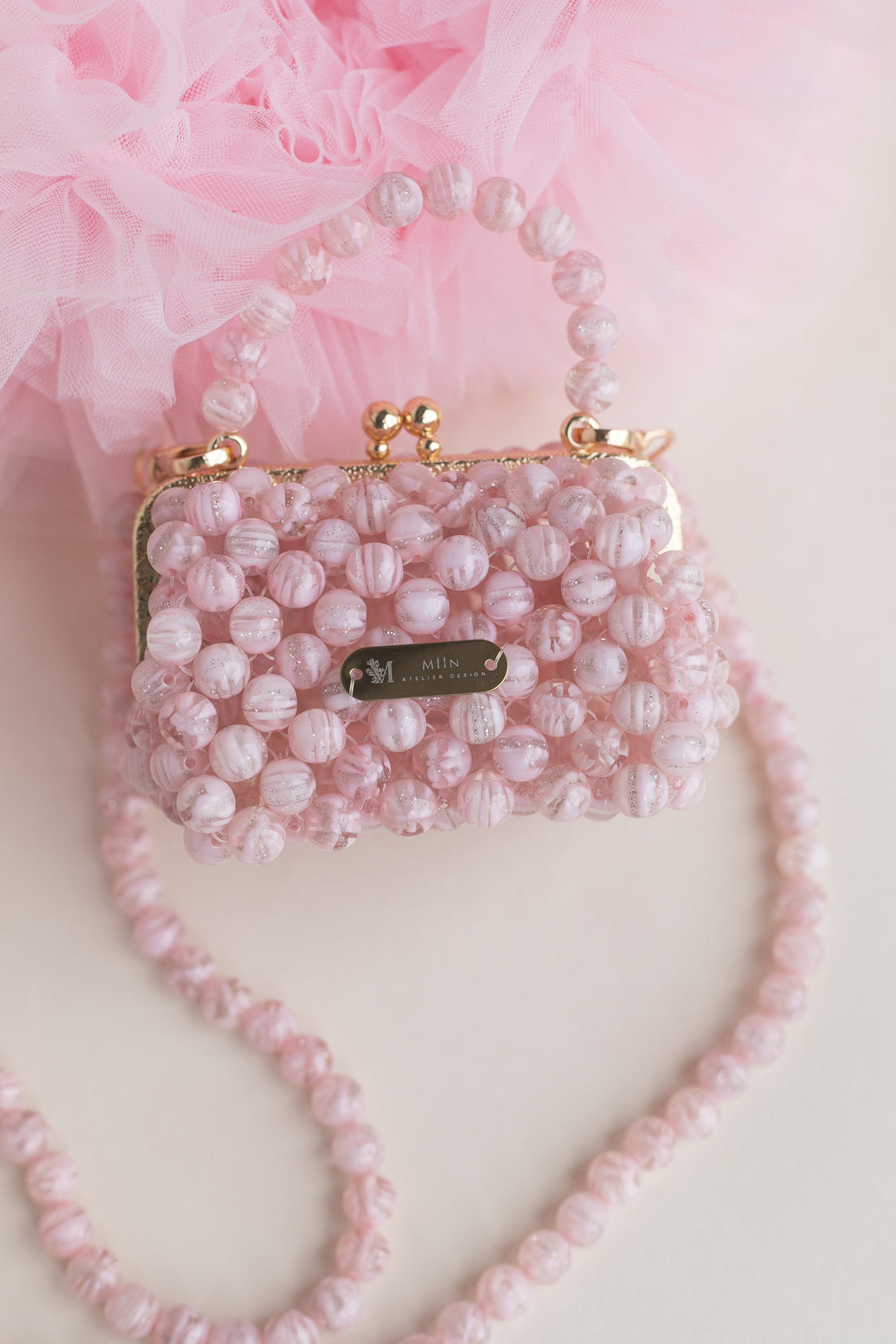 Minik stil ikonları için tasarlanan sedefli boncuk çocuk çantası, ışıltılı dokusu ve zarif altın detaylarıyla...
