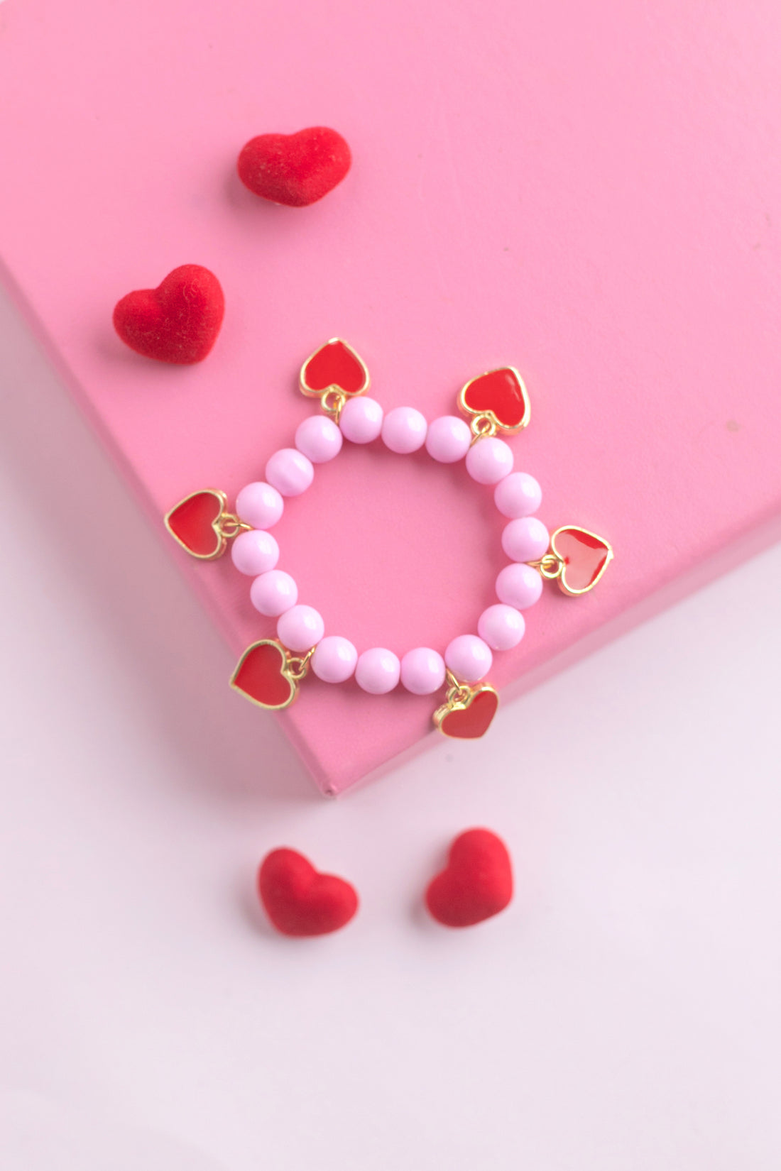 Tatlı mı tatlı, neşeli mi neşeli 💕 Pembe parlak boncuklar ve altın detaylı kırmızı kalp...