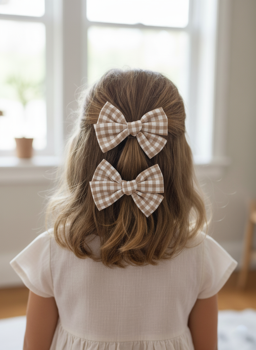 Bej rengi ekose desenin sıcak ve enerjik havasını taşıyan bu balerin fiyonk klips seti, pamuklu...