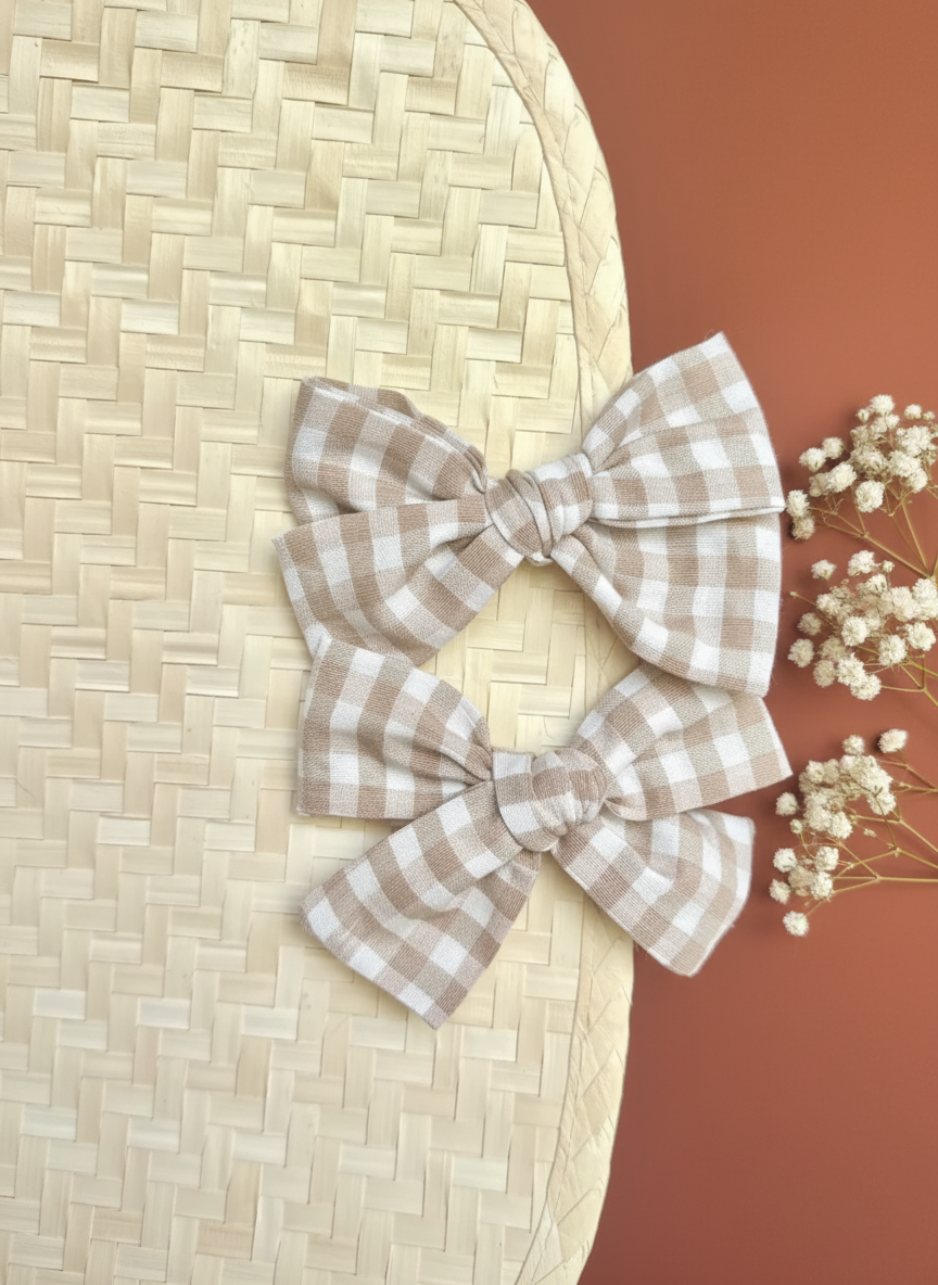 Bej rengi ekose desenin sıcak ve enerjik havasını taşıyan bu balerin fiyonk klips seti, pamuklu yapısıyla hem konforlu hem de şık bir kullanım sunar. El yapımı dokunuşlarla hazırlanmış fiyonklar, günlük kombinlere renk ve neşe katarken, sağlam klips mekanizması sayesinde saçlarda sabit durur. Kız çocuklarının hem okul hem de günlük stiline tatlı bir dokunuş katar. 🌟