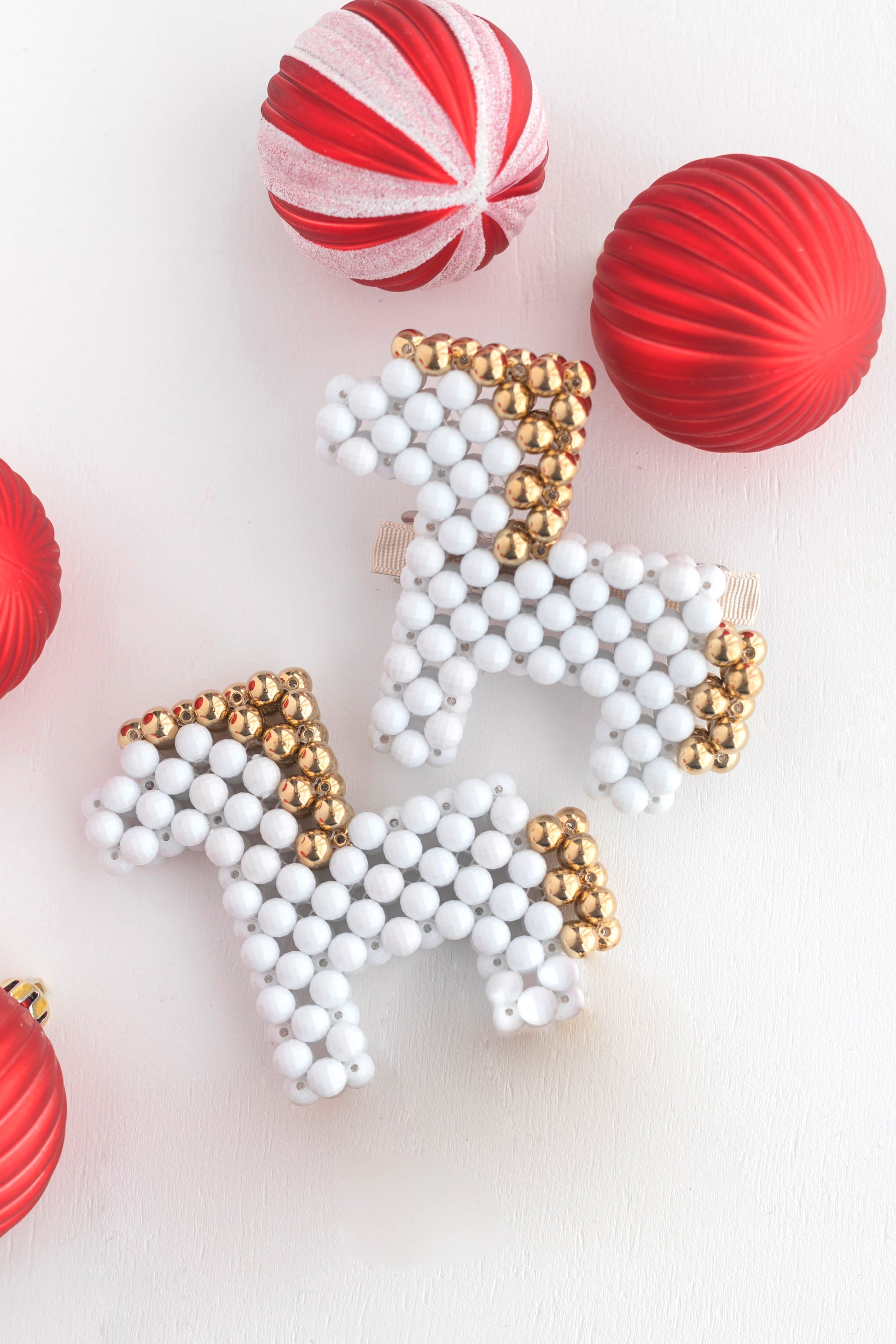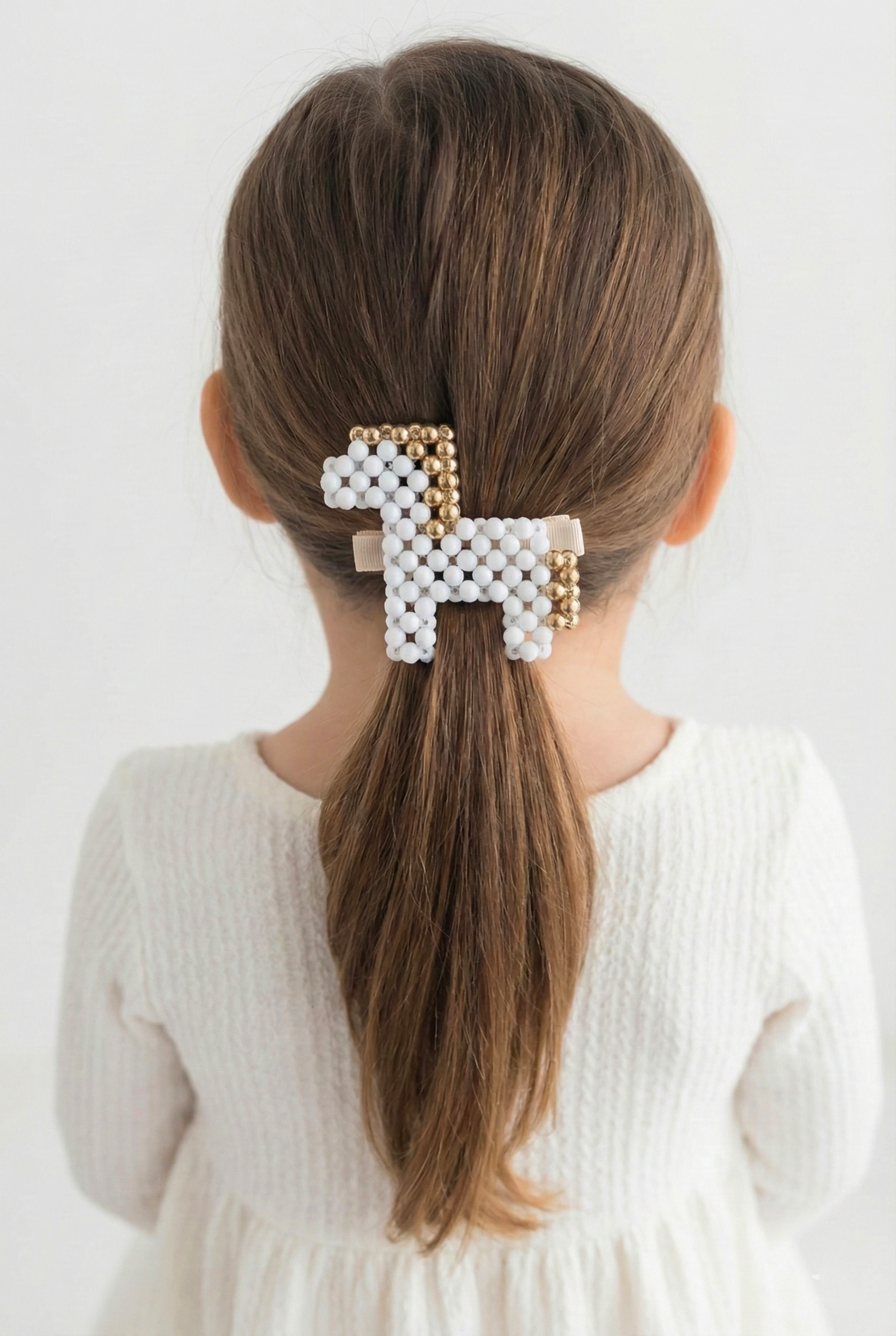 Bu el yapımı boncuk detaylı sallanan at toka, minik saçlara zarif bir dokunuş ekler. Beyaz boncuk dokusu ve gold metalik detayları, hem modern hem de nostaljik bir görünüm sunar.