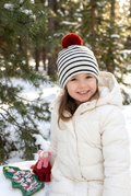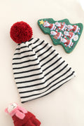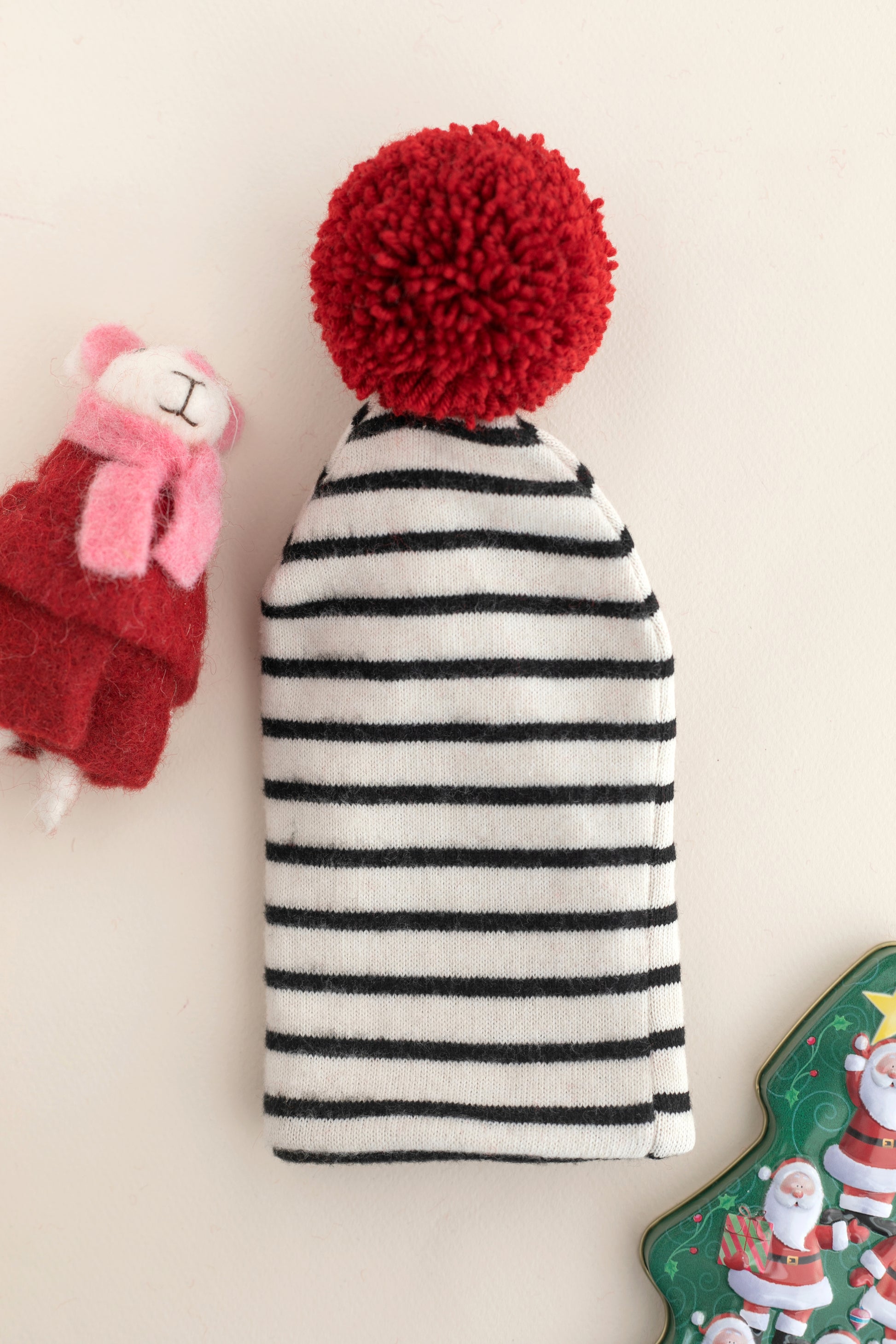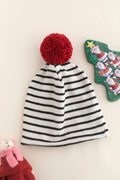 Unisex Siyah Beyaz Cizgili Kirmizi Ponpon Cift Katli Likrali Penye Bere