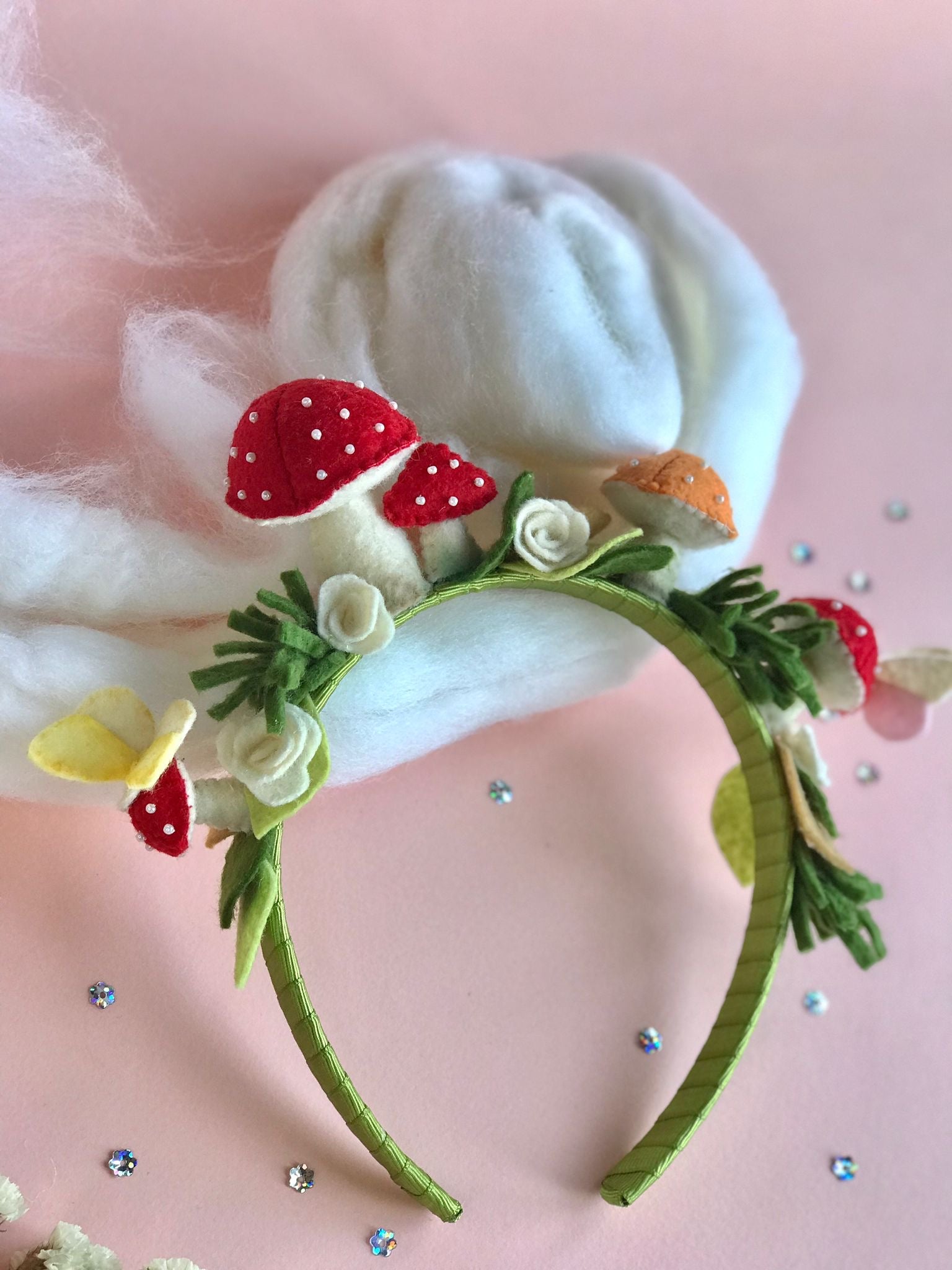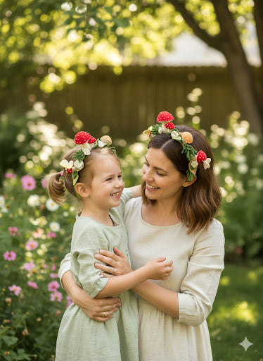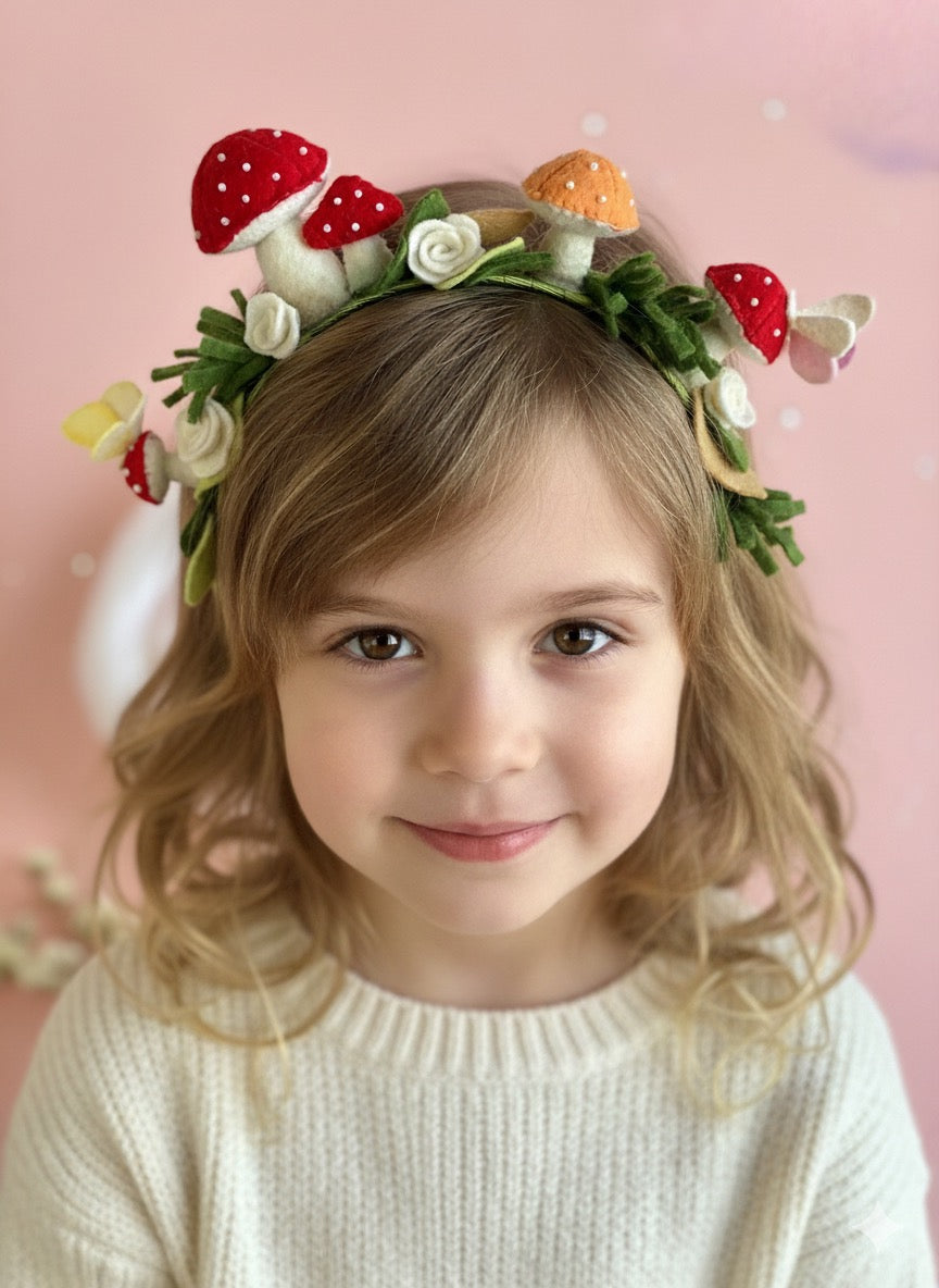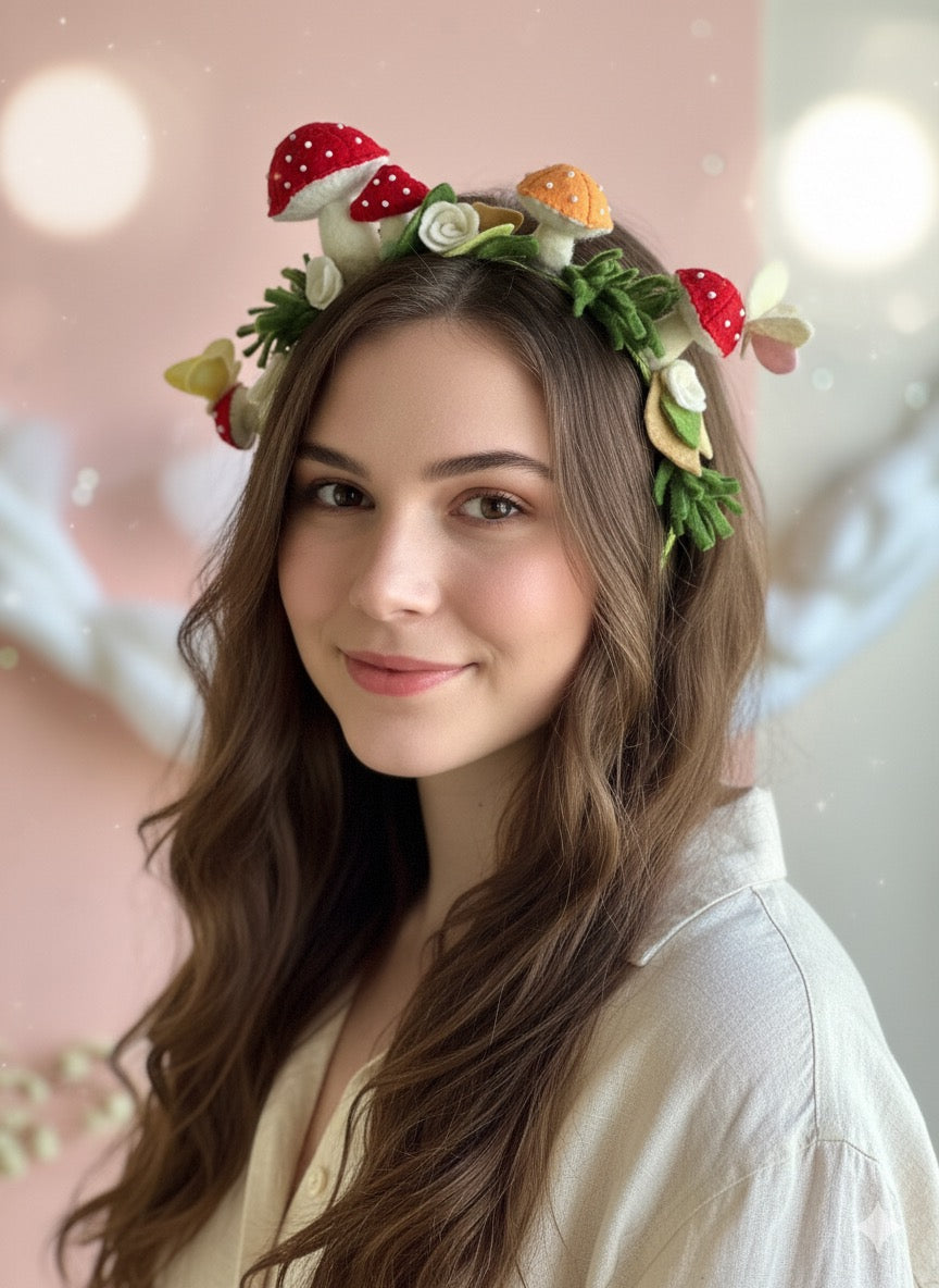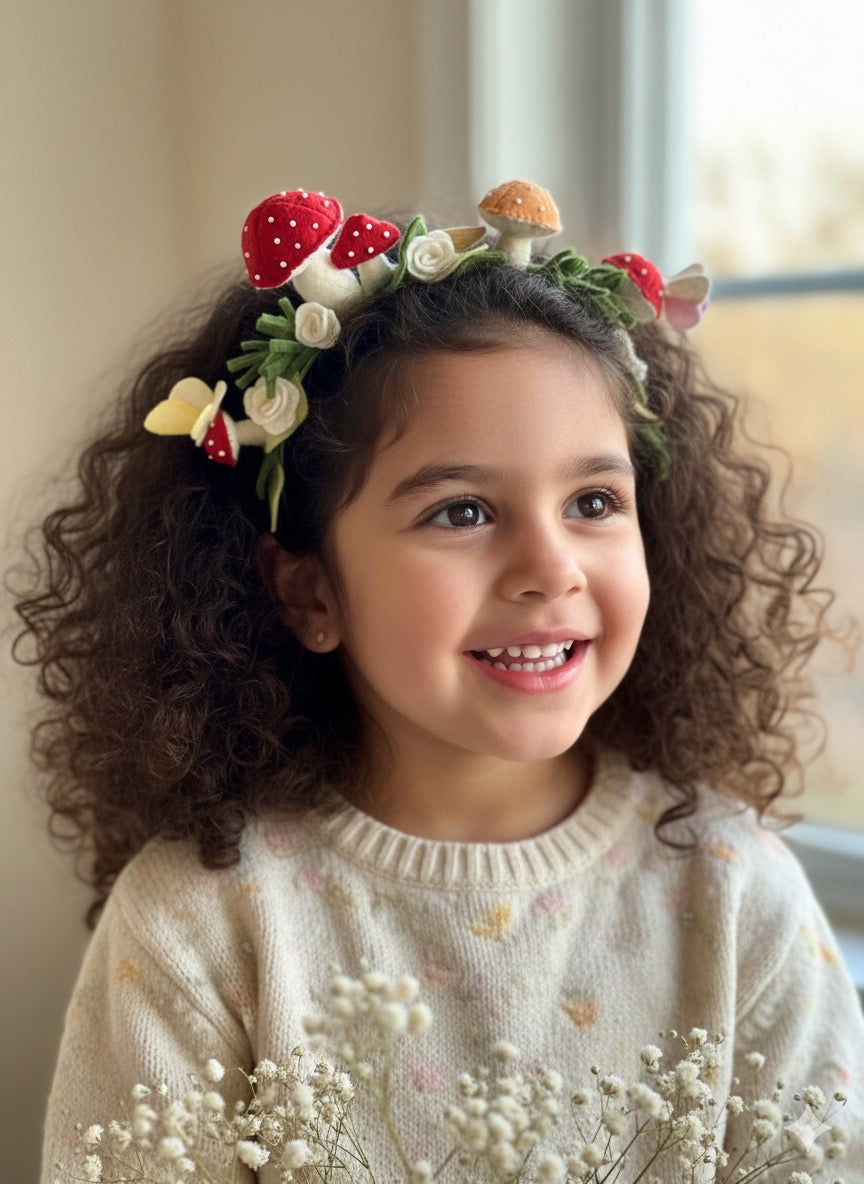 Doğanın büyüsünü saçlarınıza taşıyan Keçe Mantar Figürlü El İşi Boncuk İşlemeli Taç, tamamen el yapımı ve özel tasarım bir aksesuardır. 🌿🍄 Yumuşak keçe kumaştan elde şekillendirilen mantar figürleri, minik el işi boncuk işlemeleri ve zarif çiçek detaylarıyla birleşerek çocukların hayal dünyasını süsler.
