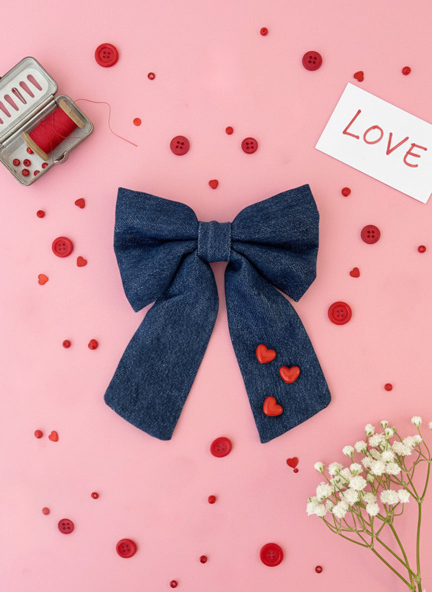 Kirmizi Kalp Boncuklu Indigo Denim Fiyonk Otomatik Klips
