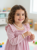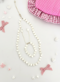 El işçiliğinin zarafetini taşıyan bu özel kız çocuk seti, tamamen elde üretilmiş sedef boncuklar ve özgün detaylarla tasarlanmıştır. Kolye ve bileklik, usta ellerde özenle dizilmiş cam boncukların bir araya gelmesiyle ortaya çıkmış, benzersiz bir el yapımı takı setidir.