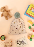 Mini Kahve Çiçekli Bej Rengi Ponpon Cift Katli Penye Bere
