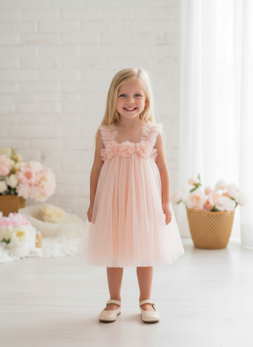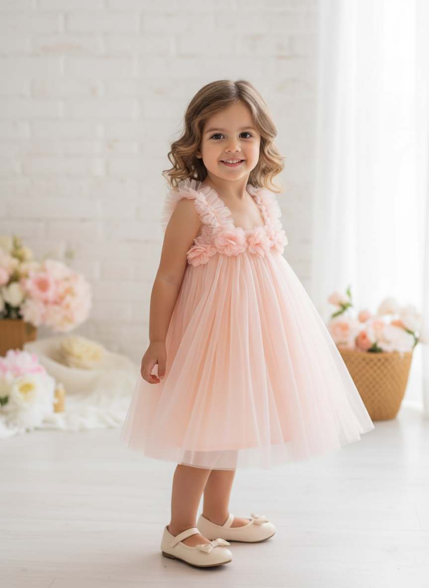 Lastikli Somon Askili Gul Motifli Tul Elbise