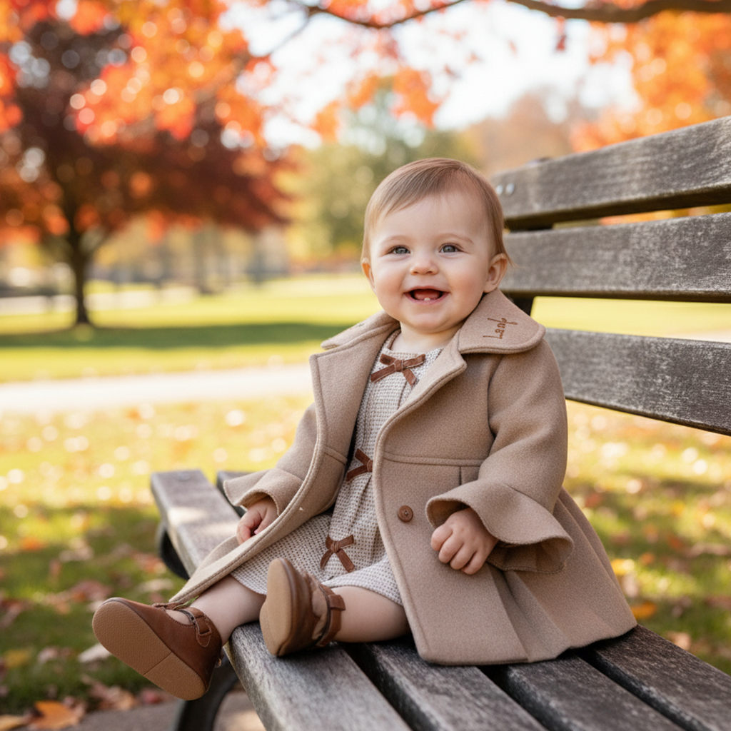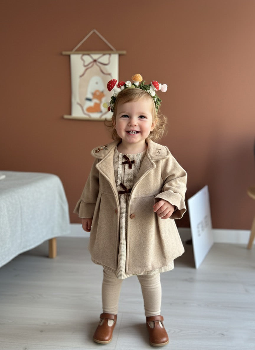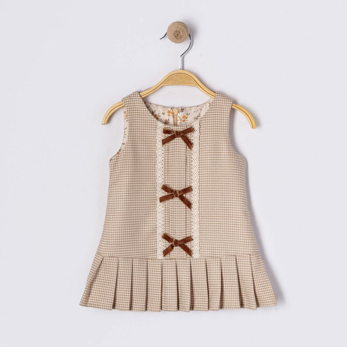 Kış günlerinde hem şık hem konforlu bir stil arayan minikler için tasarlanan bu özel takım, pileli etekli askılı jile ve yumuşak dokulu kaşe paltodan oluşuyor. Jilenin kadife fiyonk detayı romantik bir hava katarken, palto modeli zarafetiyle tamamlayıcı bir görünüm sunuyor.