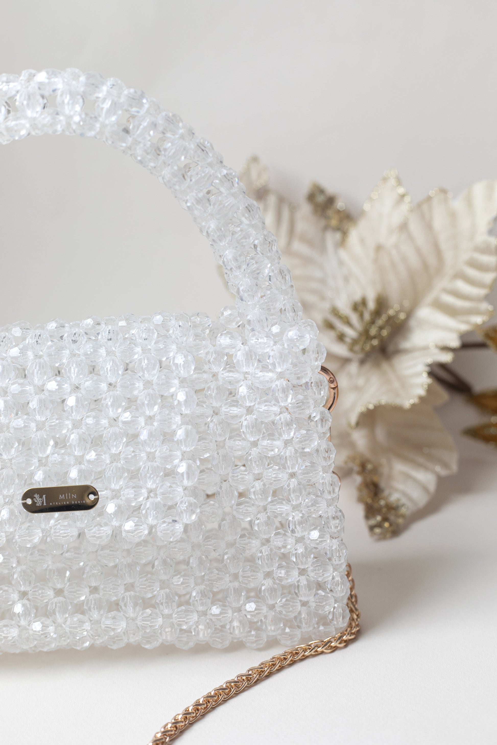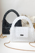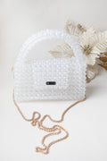 Şeffaf Kristal Boncuk İşlemeli Askılı Çanta, el işçiliğiyle tek tek dizilmiş parlak kristal boncuklardan üretilmiştir.